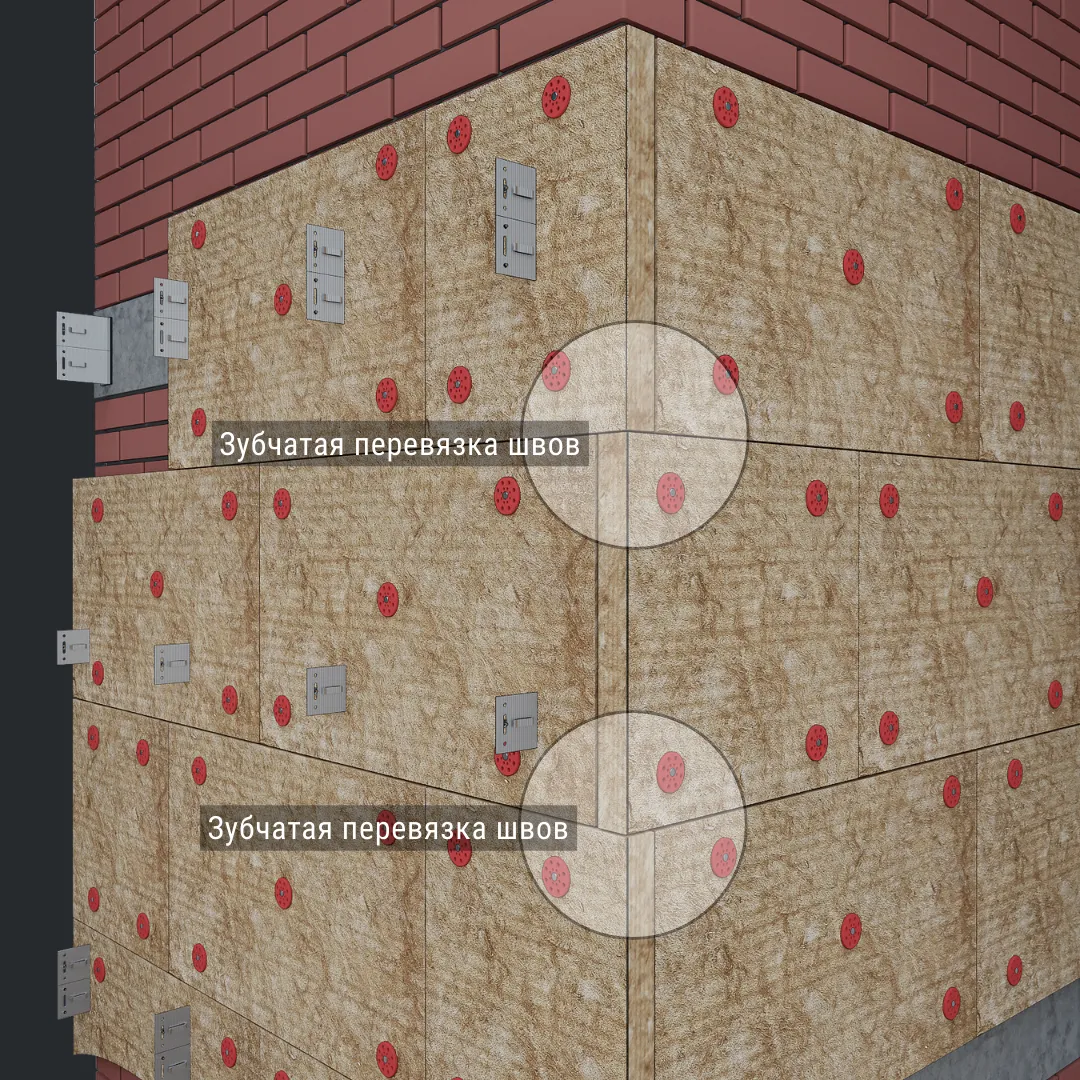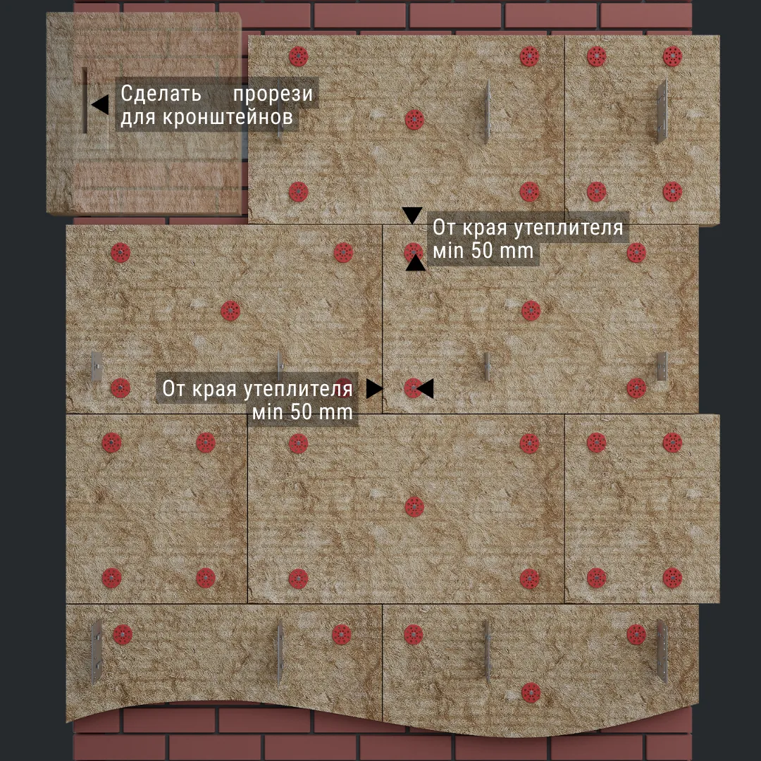 Монтаж плит из каменной ваты начинают с нижнего ряда: устанавливают на стартовый перфорированный профиль или цоколь и монтируют снизу вверх