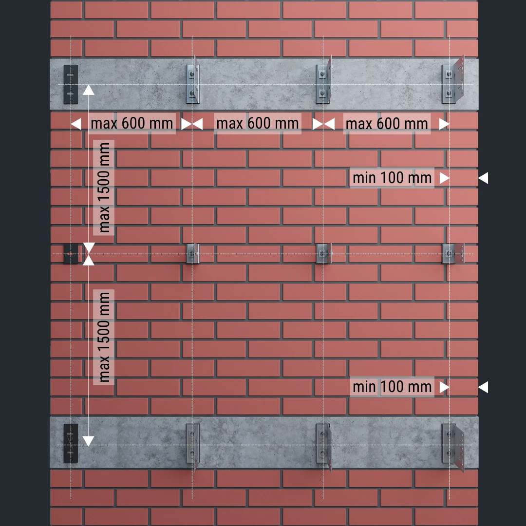 В случаях, когда основанием является кирпичная кладка, устанавливать дюбели в швы кладки нельзя. При этом расстояние от центра дюбеля до горизонтального шва должно быть не менее 25 мм, а от вертикального – 60 мм.