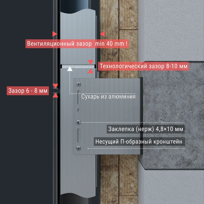 Механизм работы вентфасада основан на эффектах естественной вентиляции . Когда фасад собран, между стеной с утеплителем и облицовкой образуется вертикальный вентиляционный зазор (40-60 мм).