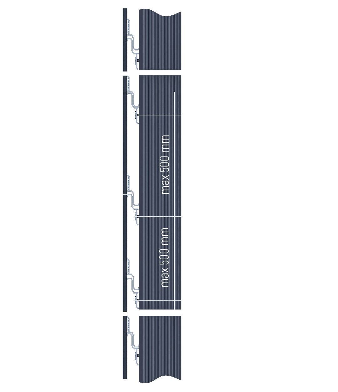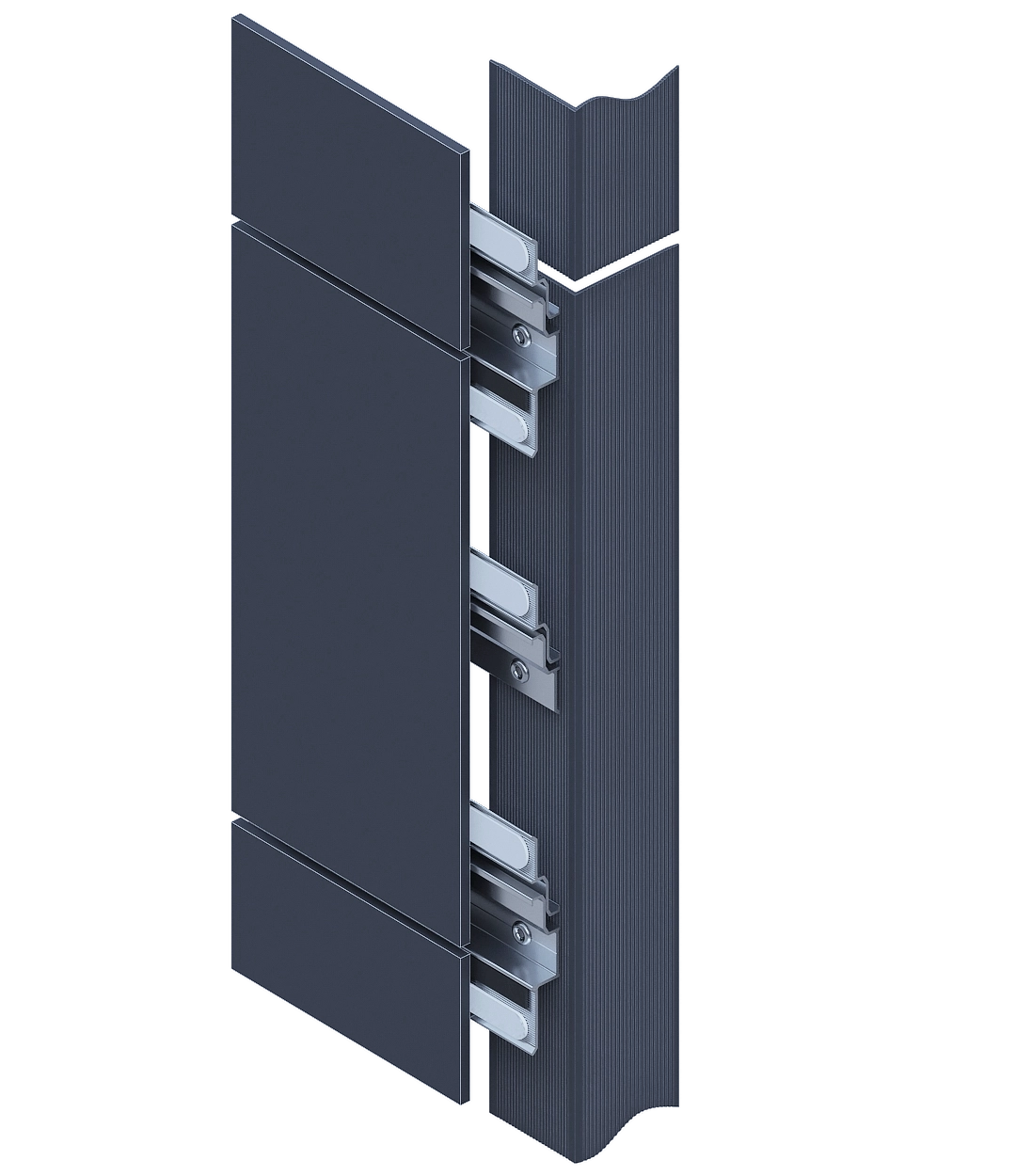 Для крепления несущих и опорных алюминиевых кронштейнов к стенам из монолитного бетона или полнотелого кирпича применяются L-образные кронштейны с последующей установкой вертикальных направляющих L- или T-профилей. В заранее размеченных точках выполняется сверление отверстий, диаметр и глубина которых соответствуют типу используемого крепежа. В качестве крепёжных элементов применяются клиновые анкеры или фасадные дюбели, прошедшие испытания на вырыв и соответствующие требованиям действующих строительных норм и правил (СНиП) для данного типа основания.